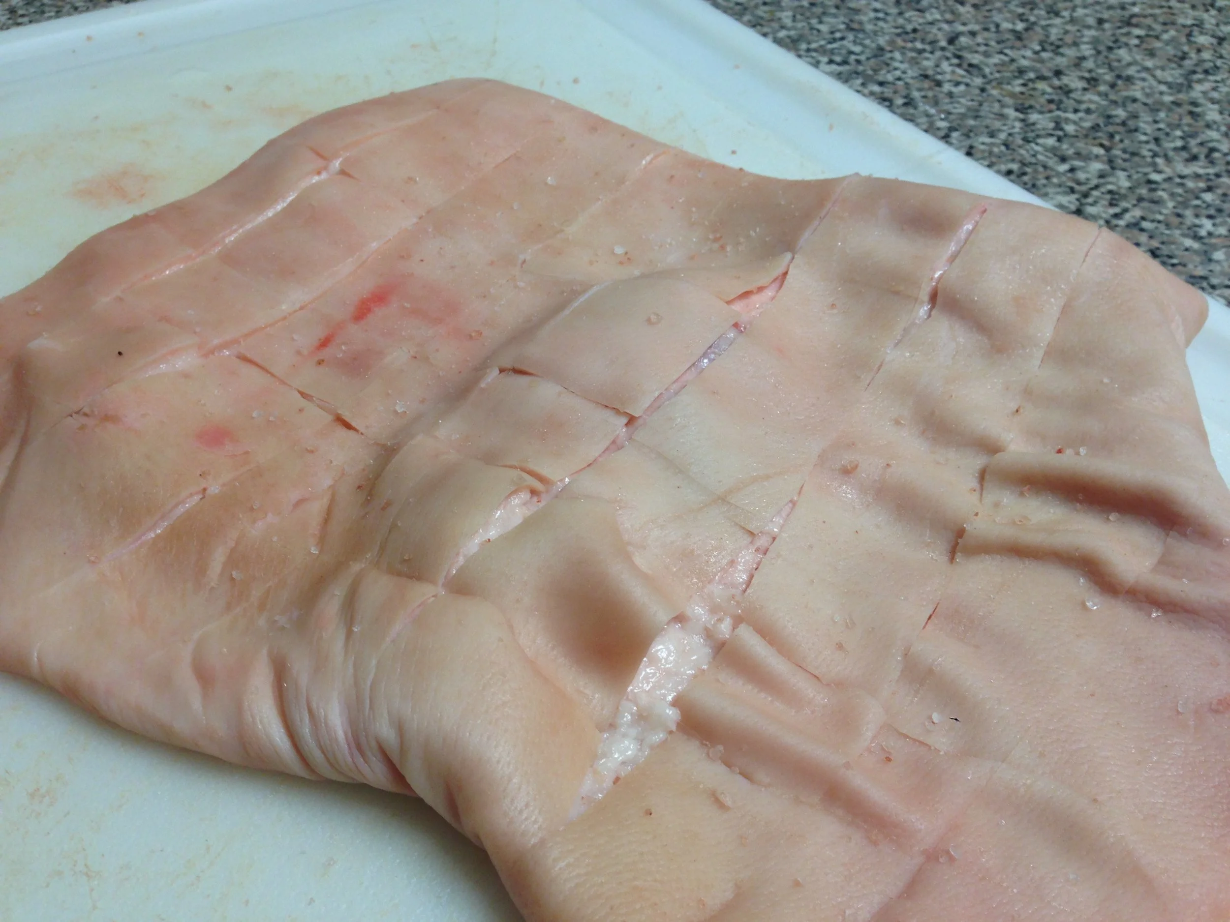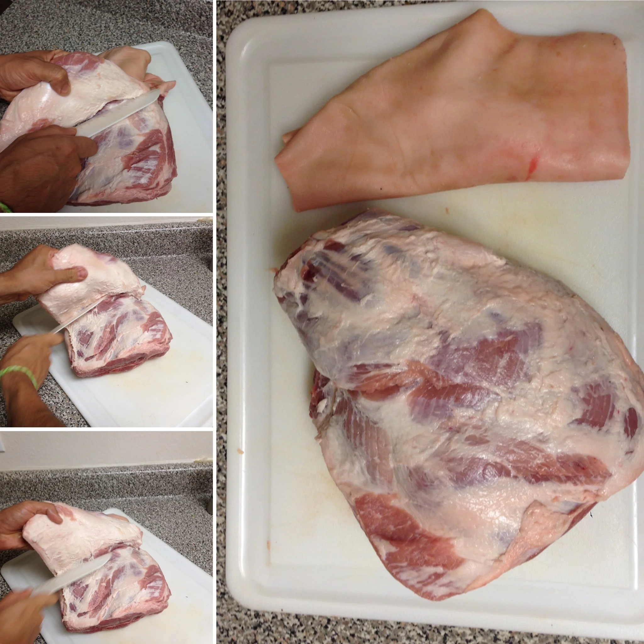 After mixing the marinade, you have to prepare the pork butt. Separate the skin from the pork butt using a very sharp knife. This is the most important part of the process, since it will help you get a crispy pork rind.