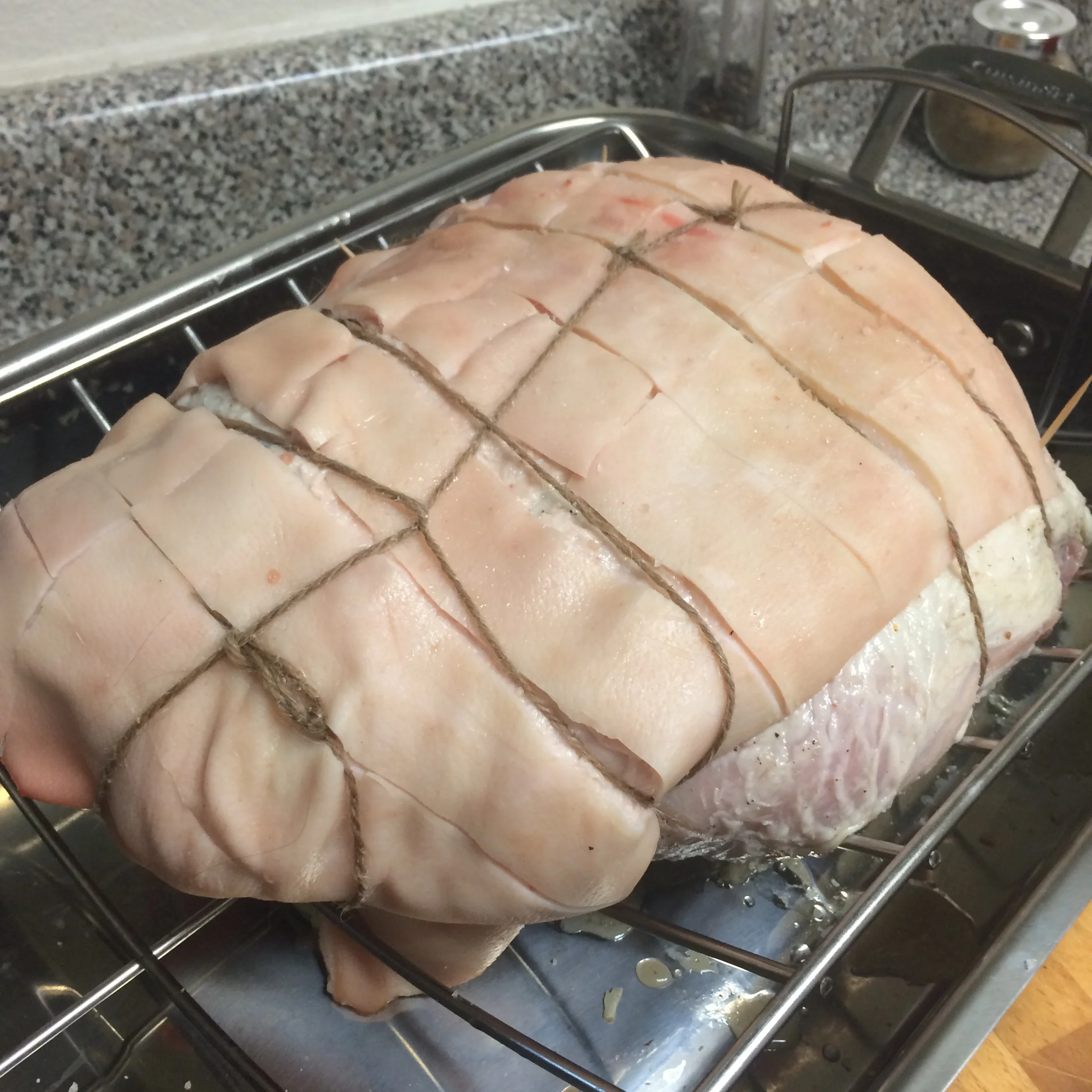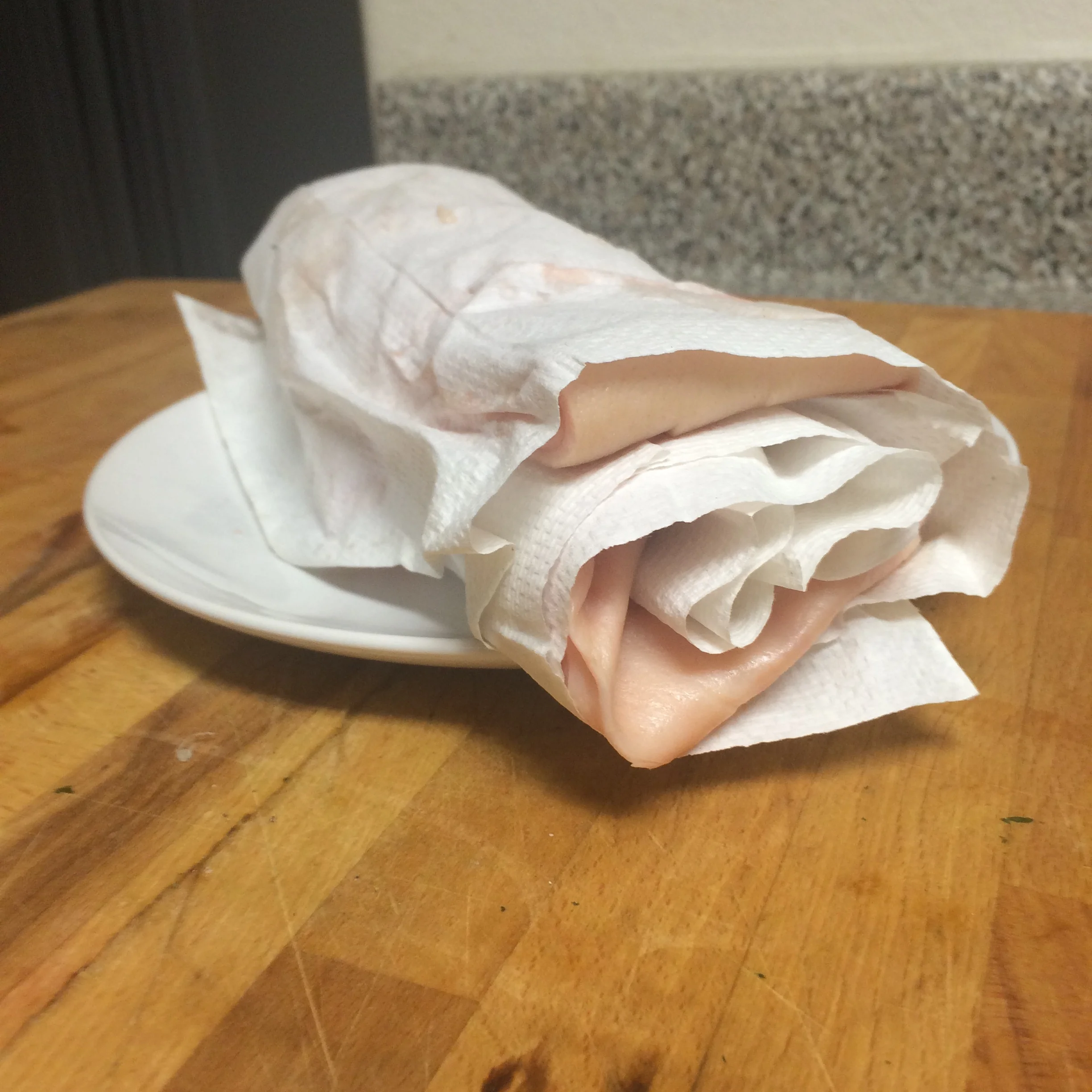 Add some salt to both sides of the skin and roll it in paper towels. You have to leave it uncovered in the fridge. This step is not super necessary, but it will help draw out the moisture from the skin. (Translation: super crispy pork skin!)