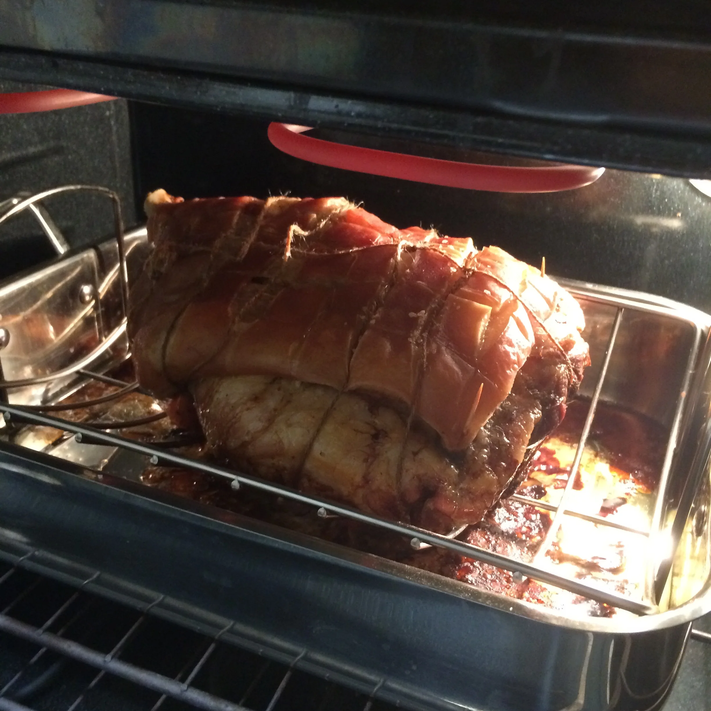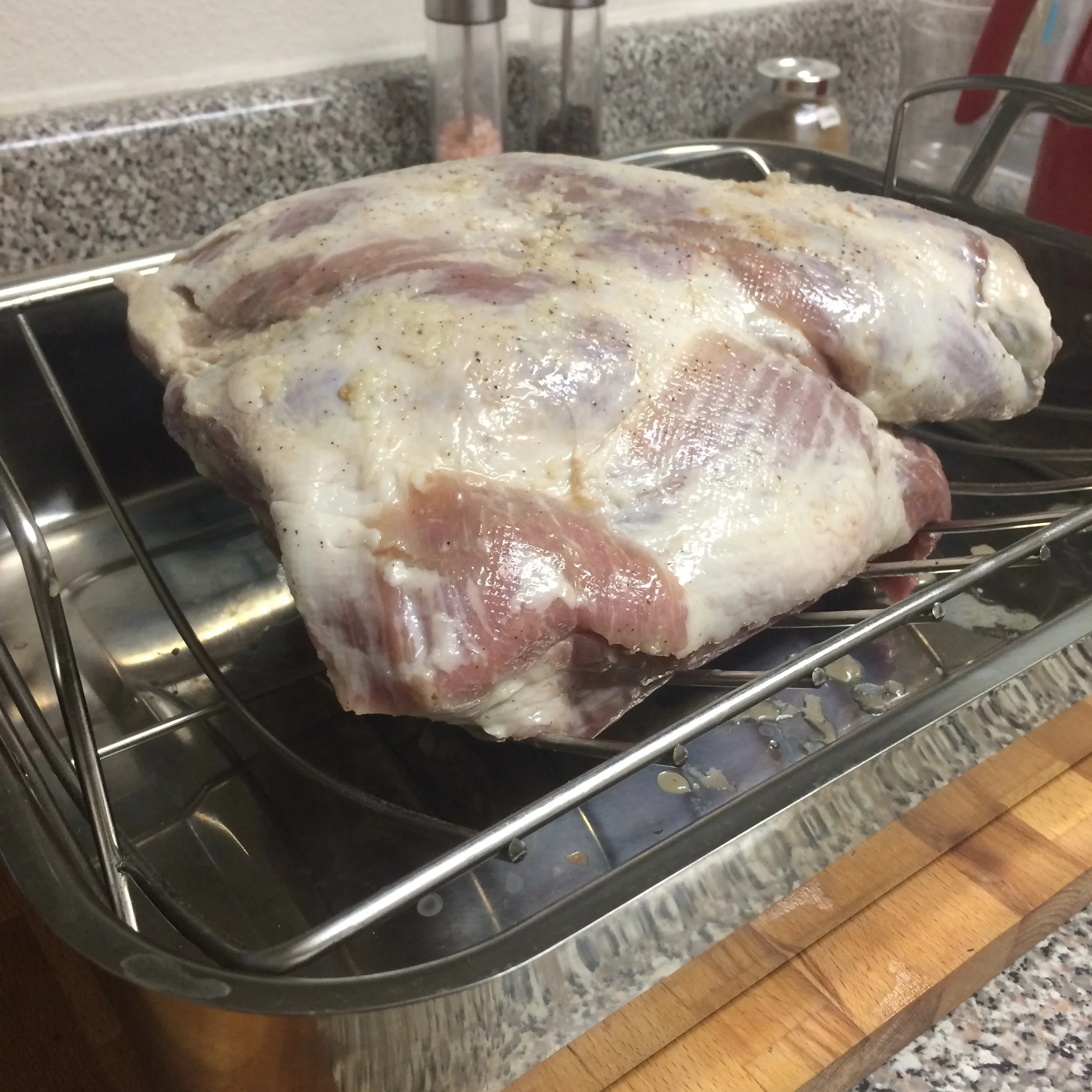 The next day you are ready to roast. Set your pork butt that has been infused with the Mojo marinade on your roaster and put the skin back on.